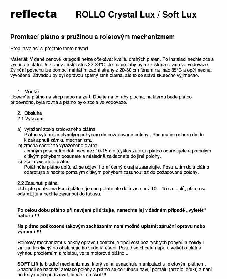 Roletové plátno SOFTLIFT CrystalLine 200x200cm s brzdou, viditelná plocha 1:1, 109"/277cm, 196x196cm, bílý hranatý kovový tubus 7x215cm/9kg, uchycení na stěnu/strop, materiál BetaLux - bílá 0,35 tkanina 300g/m2 s 2cm černým okrajem a zadní stranou, Gain=1,0, pozorovací úhel 120°. Lux - bílý matný povrch pro maximálně věrný a kontrastní obraz při alespoň částečném zatemnění. PVC materiál s textilním základem vytváří rovnou plochu bez zvlnění ale v krajích může docházet k prohnutí - postupně mizí. Snadné uchycení 4 vruty na plastových bocích plátna - stěna nebo strop. Možnost aretace polohy plátna při každé otáčce mechanizmu. SOFTLIFT mechanika brání prudkému zpětnému navinutí plátna a zároveň usnadňuje aretaci v požadované poloze. Ideální pro školy nebo místa, kde hrozí nesprávná manipulace s běžným ROLLO plátnem..