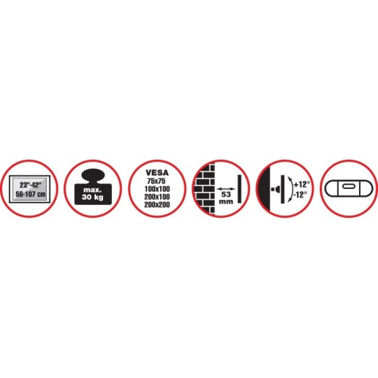 Nástěnný ocelový držák s minimální vzdáleností od stěny na velké LCD TV s uhlopříčkou 37"- 70" (94-178cm) a hmotností maximálně 35kg. Konzole na zavěšení TV s upevněnými držáky, vertikálně výklopný +0°/-12°, vzdálenost od stěny 30mm, rozměry 702 x 450 x 30 mm, barva černá. Uchycení VESA: 200x200, 300x200, 300x300, 400x200, 400x300, 400x400, 600x400. Fine Tuning pro snadné přesné ustavení po fixaci ke zdi..