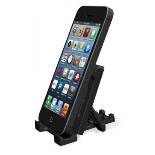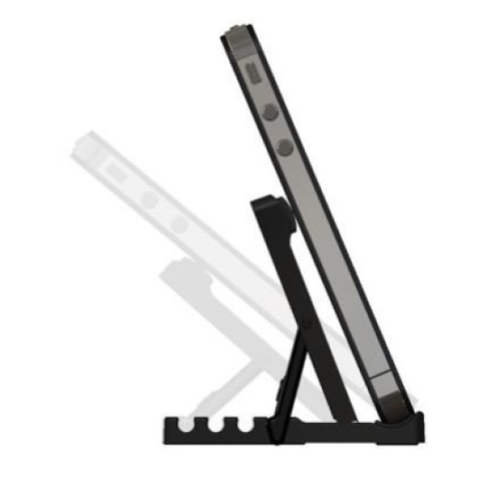 Stojánek pro chytré dotykové telefony v horizontální i vertikální poloze na stůl. Možnost nastavení 5 úhlů, skládací mechanizmus pro snadný transport, opření telefonu na spodní hraně, plastové provedení, černý..