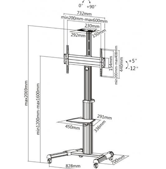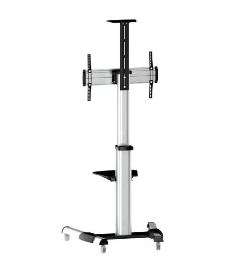 Moderní televizní stolek na Plasma a LCD TV s uhlopříčkou 37"- 70" (94-178cm) a hmotností maximálně 50kg. Středová teleskopická nosná tyč na kolečkách, držák otočný o 90° a vertikálně výklopný +5°/-12°, horní výškově nastavitelná plocha pro kameru, polička, AluDesign, barva stříbrná. Uchycení VESA: 200x200, 300x300, 400x200, 400x400, 600x400..