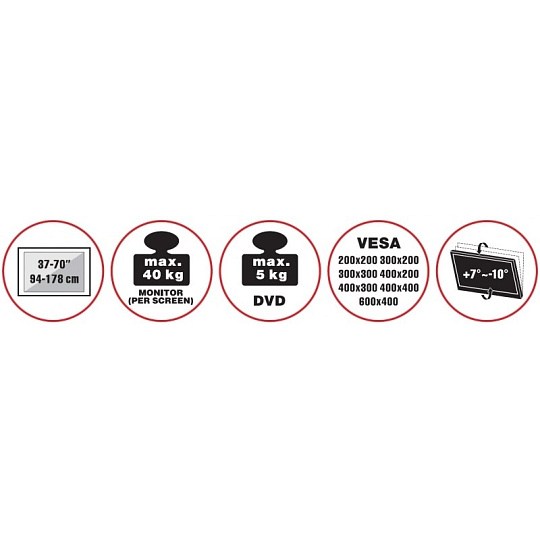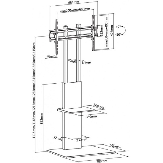 Designový stolek na velké LCD TV s uhlopříčkou 37"- 70" (94-178cm) a hmotností maximálně 40kg. Středový nosný profil 111,5-141,5cm na elegantní základní desce, držák výklopný +7°/-10°, polička 30x35cm max 5kg, ocelová konstrukce až ke zdi, rozměr 70x52x161,8cm, barva černá. Uchycení VESA: 200x200, 300x200, 300x300, 400x200, 400x300, 400x400, 600x400..
