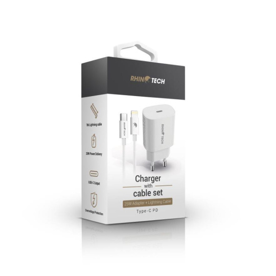 RhinoTech praktický set rychlonabíjecího adaptéru (25W) a USB-C na Lightning kabelu (27W), pro bezpečné a rychlé nabíjení Vašeho zařízení.