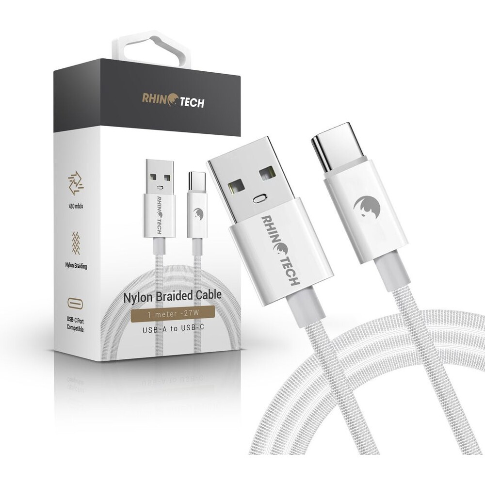 RhinoTech kabel s nylonovým opletem USB-A na USB-C 27W, 1 m bílý