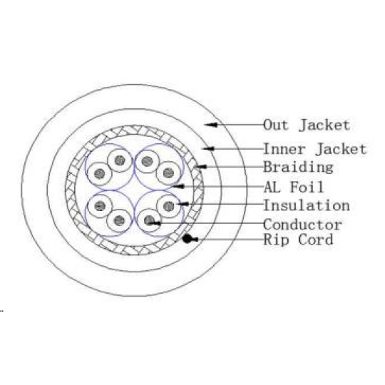 Kabel S/FTP 4 páry LSZH+PE CAT 7 drát 23AWG čistá měď. Speciálně pro venkovní použití, nebo v extremnějších podmínkách, měrky po metrech, balení na dřevěných cívkách po 500m. Dvojitý plášť LSZH + PE (UV stabilní)