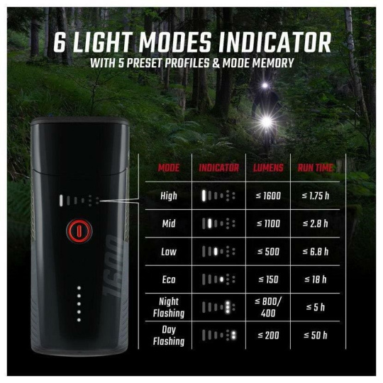 6 světelných režimů: High (1600 lm), Mid (1100 lm), Low (500 lm), Eco (150 lm), Night Flashing (800/400 lm), Day Flashing (200 lm)