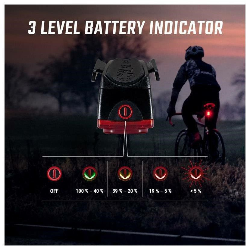 Světlo se zapíná dvojitým stisknutím. Velké tlačítko zapnutí lze snadno ovládat i v rukavicích. Tato funkce zajistí, že zadní světlo lze bez problémů schovat do kapsy dresu nebo do batohu, aniž by se nedopatřením rozsvítilo.