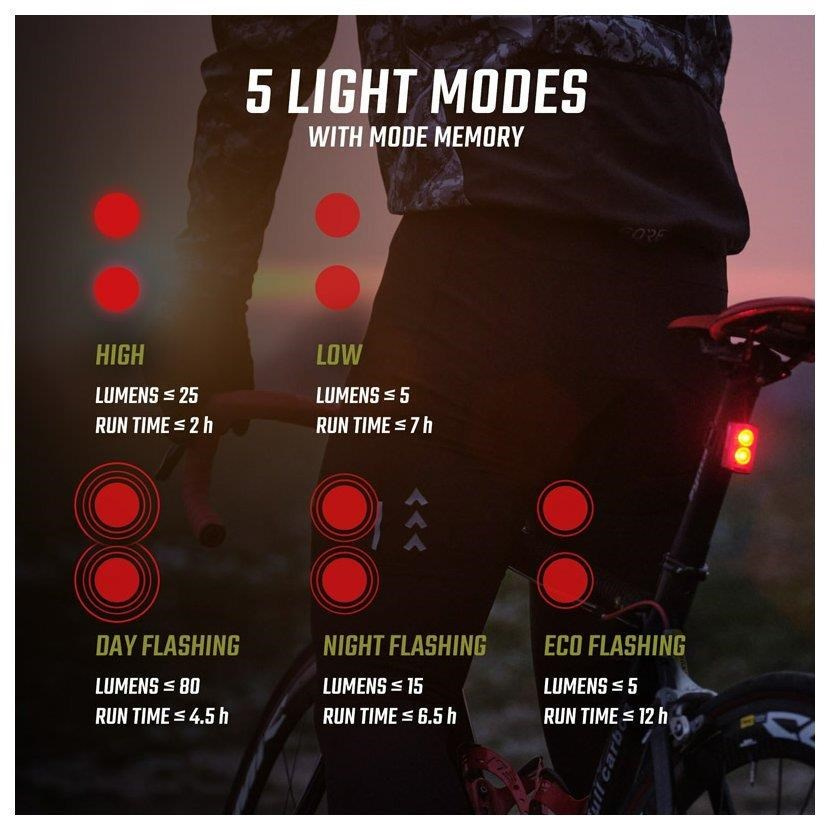 S Buster RL 80 máte na výběr z pěti světelných režimů, pomocí kterých můžete individuálně nastavit intenzitu osvětlení a dobu výdrže baterie. V režimu High dosahuje světlo Buster RL 80 světelného výkonu 25 lumenů po dobu až 2 hodin, v režimu Low svítí až 7 hodin při světelném výkonu 5 lumenů. Režim Day Flash dokáže pomocí dvou červených blikajících LED upozorňovat na cyklistu po dobu 4,5 hodin se světelným výkonem 80 lumenů. V režimu Night Flashing bliká zadní světlo až 6,5 hodiny při světleném výkonu 15 lumenů. Pokud jízda trvá déle, dokáže zajišťovat viditelnost v silničním provozu režim Eco Flash až po dobu 12 hodin.