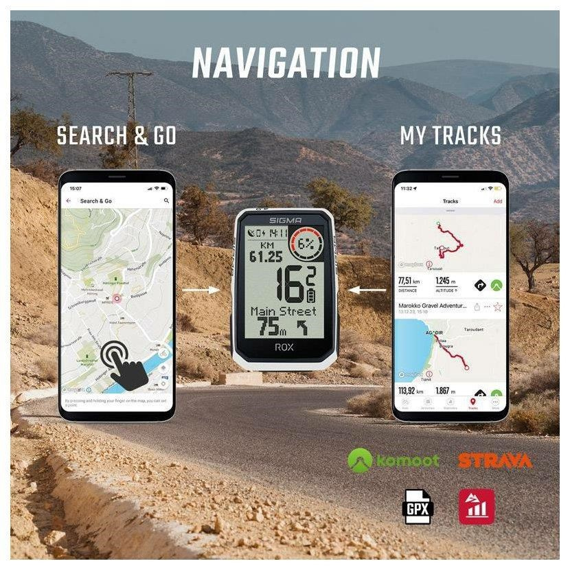 Během navigace se na displeji ROX 4.0 Endurance zobrazuje trasa a pokyny pro odbočení "Turn-by-Turn". Odbočovací šipka a akustický signál ukazují další odbočku. Abyste odbočku nepřehlédli, odpočítává červený kruh pomocí barevných pruhů vzdálenost do další odbočky. Ty se zmenšují, čím blíže jste k odbočce. ROX 4.0 Endurance také zobrazuje názvy ulic. Pokud se spontánně odchýlíte od navržené trasy, zařízení ROX v součinnosti s aplikací SIGMA RIDE rychle naplánuje novou trasu do cíle s odpovídajícím aktualizovaným výškovým profilem.