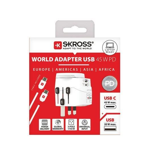 SKROSS PRO Light USB AC45PD – World zajišťuje jednoduché a bezpečné připojení zařízení ve více než 200 zemích. Podporuje dvoupólové i třípólové zástrčky a zvládne napájet výkonné spotřebiče, jako jsou notebooky či cestovní fény. Díky integrované nabíječce s porty USB-C a USB-A lze současně nabíjet více zařízení.