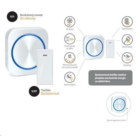 zvonkové tlačítko na principu dynama, elektrický signál pro zvonění je vytvořen převodem mechanické energie stisknutím tlačítka. Není třeba se starat o nákladné výměny baterií, zvláště v zimním období. 4 režimy zvonění: pouze zvonění, pouze blikání, zvonění i blikání, zvonění a nepřetržité svícení. Režim nepřetržitého svícení slouží i jako noční světélko. velká světelná signalizace, vhodné do hlučného prostředí nebo pro osoby se sluchovým postižením funkce „Learning code“ umožňuje spárování více zvonků nebo tlačítek do jedné skupiny 58 volitelných melodií paměť nastavení i při vytažení ze zásuvky nebo výpadku elektrické energie LED indikátor zvonění na zvonku i tlačítku tlačítko s krytem na jmenovku vodotěsná ochrana tlačítka IP44 nastavení hlasitosti zvonku - 4 stupně (25 - 85dB) uchycení tlačítka pomocí samolepicí podložky nebo montážních otvorů dosah signálu na otevřeném prostranství: 150m přenosová frekvence: 433MHz napájení: tlačítko: bez baterií, životnost 200 000 stisknutí zvonek: AC 230V - do zásuvky pracovní teplota: zvonek -10°C až +40°C, tlačítko bez omezení spotřeba energie: přijímač (zvonek) v klidovém režimu: <0,5W barva: bílá náhradní tlačítko Solight č. 1L51T k jednomu zvonku mohou být spárována max. 6 tlačítek jedno tlačítko může být spárováno s max. 6 zvonky.
