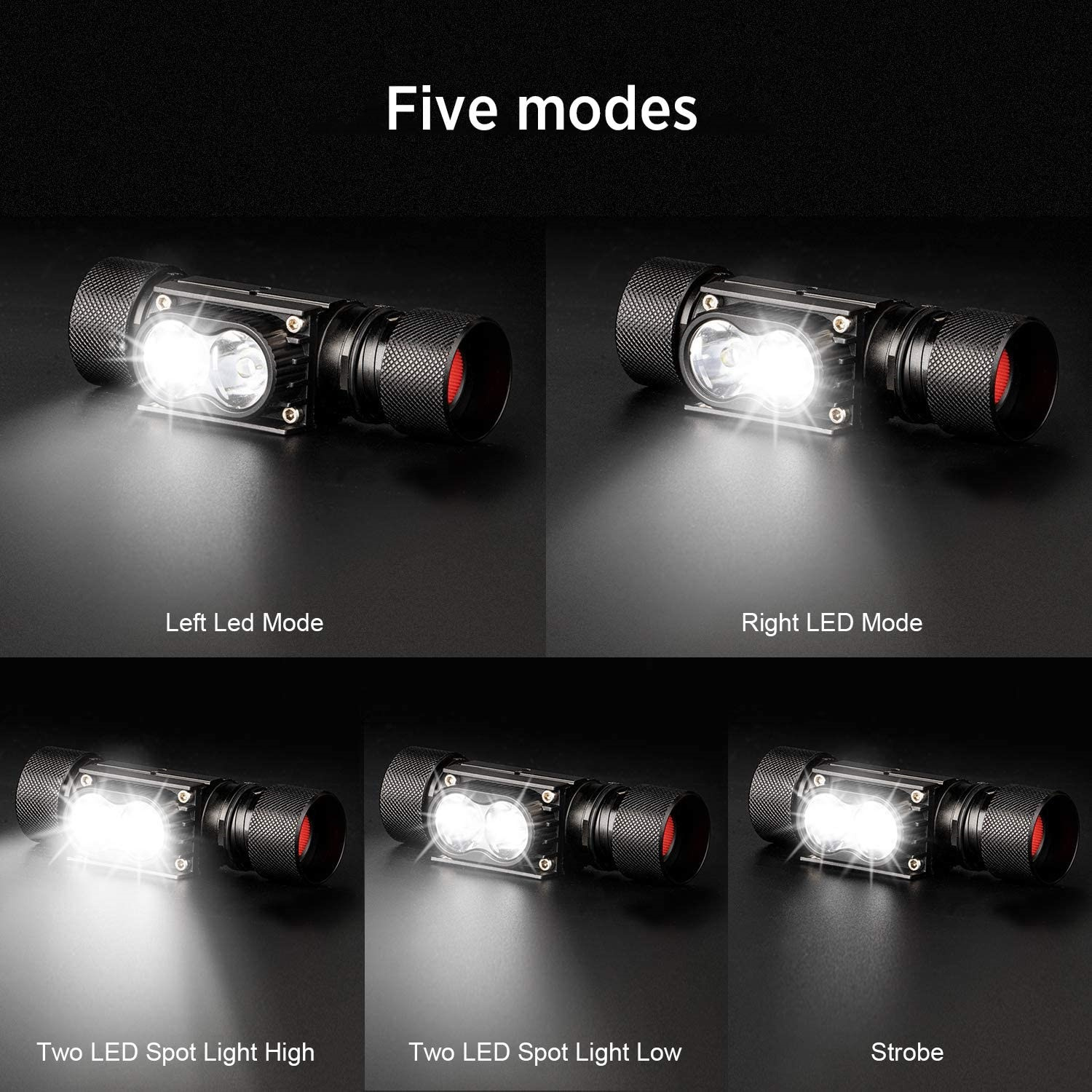 • 5 režimů svícení: pravá LED 100%, levá LED 100%, obě LED 100%, obě LED 50%, blikání