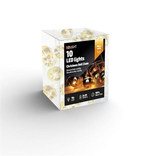 Solight LED vánoční řetěz rolničky, 10x LED, zlatá, 1,5m, 2x AA