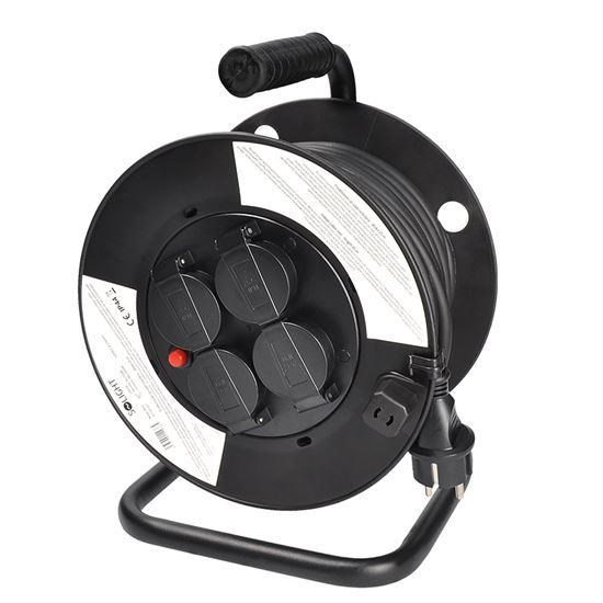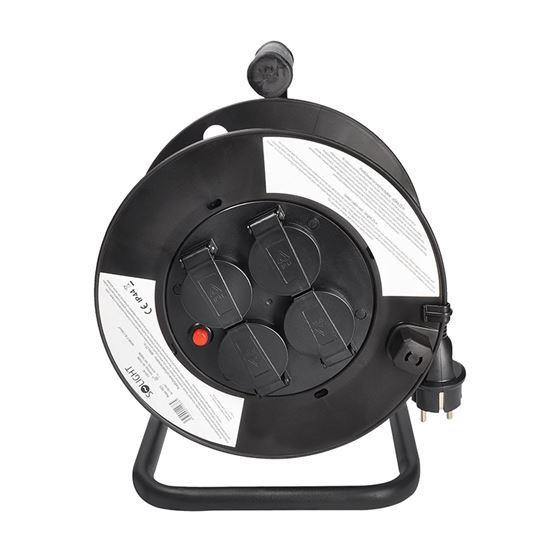 Gumový kabel typ H05RR-F 3G s vodiči o průřezu 3×1,5 mm2 je vhodný pro venkovní použití i vnitřní prostory. Buben je vybaven zásuvkami s dětskými pojistkami a tepelnou pojistkou, která zajišťuje bezpečnost při přetížení nebo neúplném odvinutí kabelu. Produkt splňuje stupeň krytí IP44, který zajišťuje ochranu proti stříkající vodě. Vhodný pro bezpečné a spolehlivé připojení stavebních, zahradních i méně náročných průmyslových zařízení.