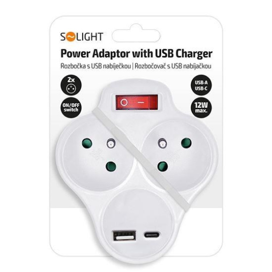 Solight rozbočka s USB A+C nabíječkou, 2 x 10A, bílá, vypínač