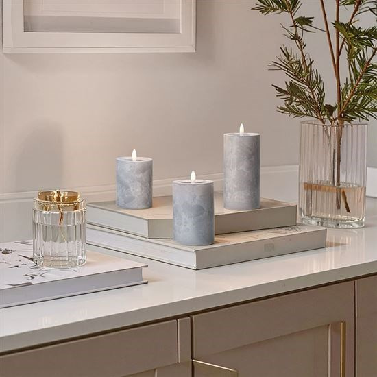 Vytvořte si elegantní atmosféru s LED svíčkami s efektem přirozeně blikajícího plamene a luxusním dekorem šedého mramoru. Tato sada tří svíček vnese do vašeho interiéru moderní a útulný vzhled bez nebezpečí otevřeného ohně.