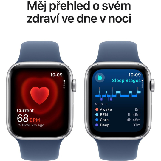 Apple Watch SE (2024) 44mm Stříbrný hliník s denimovým sportovním řemínkem S/M