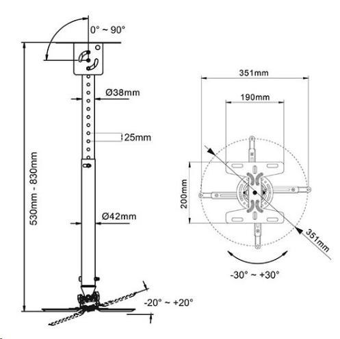 Stropní držák na projektory Fiber Mounts T718-2 černý Držák na projektory, univerzální, otočný, sklopný, délkové nastavení, barva černá Kvalitní stropní držák pro zavěšení všech typů projektorů s hmotností do 13,6kg. Plná nastavitelnost polohy projektoru - nastavení vzdálenosti od stropu 53÷83cm, otáčení do stran, náklon v obou osách, možnost uchycení i na šikmé stropy. Vynikající kvalita, pěkný design. Barevné provedení černé. Fiber Mounts NBT718-2 stropní držák na projektory v černém provedení, otočný, sklopný, délkově nastavitelný, i na šikmé stropy, TOP kvalita Technické údaje: max. zatížení 13,6kg na všechny typy projektorů s podporou zavěšení nastavitelná vzdálenost od stropu 530-830mm náklon +20° až -20° otáčení do stran +60° až -60° korekce roviny projektoru +20° až -20° možnost přetočení úchytu z vodorovné pozice do svislé podporuje 3-bodové i 4-bodové zavěšení projektoru profesionální kvalita snadná nastavitelnost montážní materiál součástí balení krásný design barva černá záruka 5 let.