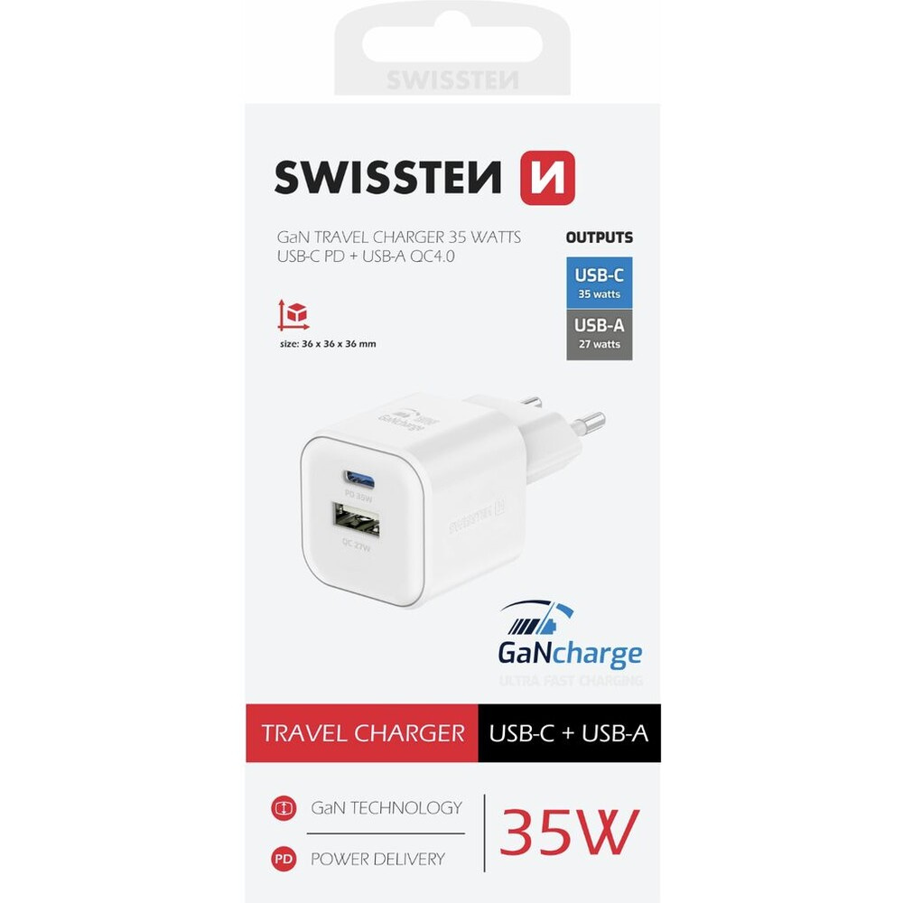 Swissten síťový adaptér GaN 1x USB-C 35W PD + 1x USB-A 27W QC bílý