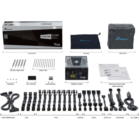 SATA, MOLEX, PCIe 6+2-pin, ATX 20+4pin, 4pin CPU, 8pin CPU
