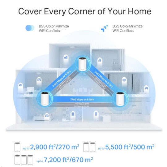 | WiFi Range | 4-7+ Bedroom Houses (3-pack) TP-Link Mesh Technology Optional Ethernet backhaul work together to link Deco units to provide seamless coverage AI-Driven Mesh Intelligently learns the network environment to provide ideal Wi-Fi unique to your home 4× High-Gain Antennas (Internal) Multiple antennas form a signal-boosting array to cover more directions and large areas Tri-Band A newly-opened 6 GHz band brings more bandwidth and faster speeds Beamforming Concentrates wireless signal strength towards clients to expand WiFi range |