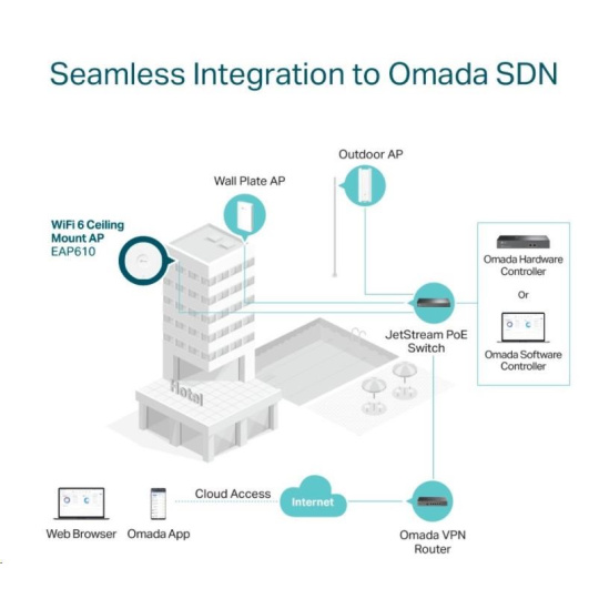 • Centralizovaná cloudová správa: Celou síť můžete spravovat lokálně nebo přes cloud prostřednictvím webového rozhraní nebo aplikace Omada.