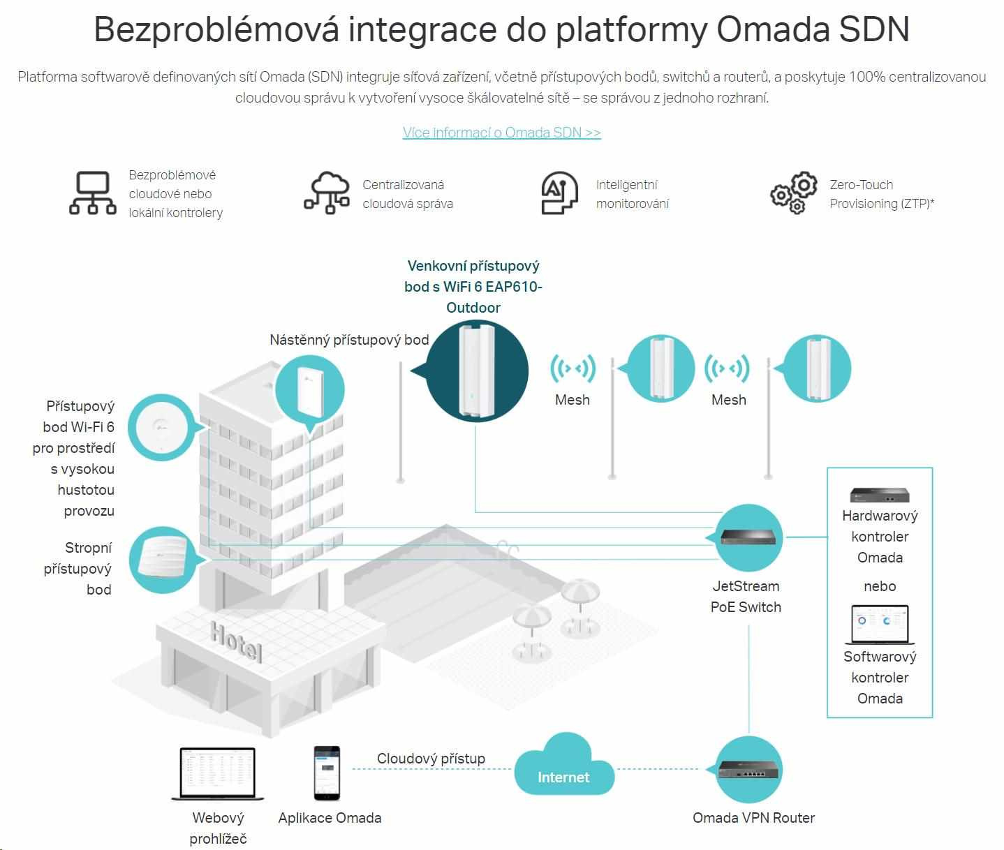 - Centralizovaná cloudová správa: Integrace s platformou Omada SDN umožňuje cloudový přístup a vzdálenou správu.