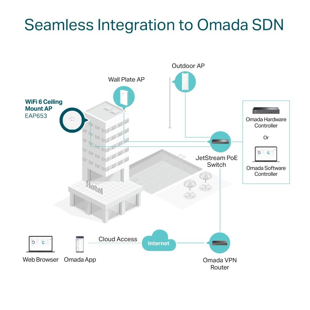 - Centralizovaná cloudová správa - díky integraci do platformy Omada SDN můžete celou síť spravovat lokálně nebo přes cloud prostřednictvím webového rozhraní nebo aplikace Omada.