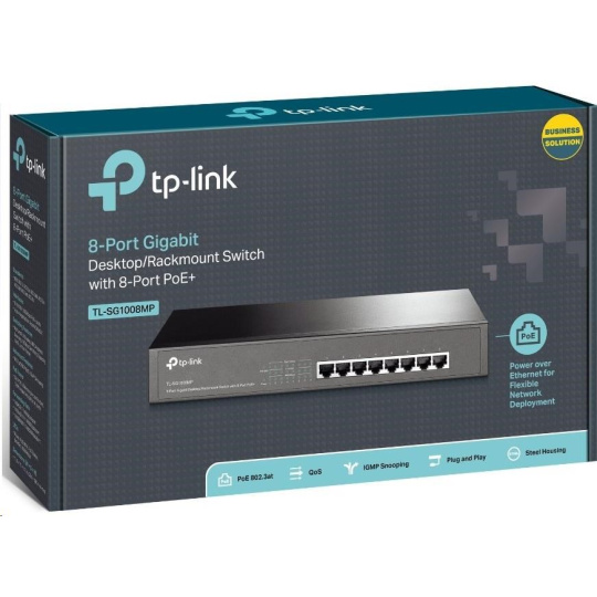 TL-SG1008MP je 8portový gigabitový stolní/rackový switch, přičemž všech 8 portů podporuje standard napájení PoE+. Zařízení představuje snadné řešení, jak rozšířit kabelovou síť, neboť umožňuje přenášet napájení i data pomocí jediného ethernetovém kabelu. S celkovým rozpočtem napájení 153 W, tzn. až 30 W na každý port, switch TL-SG1008MP dokáže napájet větší počet zařízení s vysokým odběrem, jako jsou přístupové body, IP kamery nebo IP telefony. Navíc s inovativní technologií úspory energie je switch TL-SG1008MP schopen snížit spotřebu energie, což z něj činí ekologické řešení pro vaši podnikovou síť.