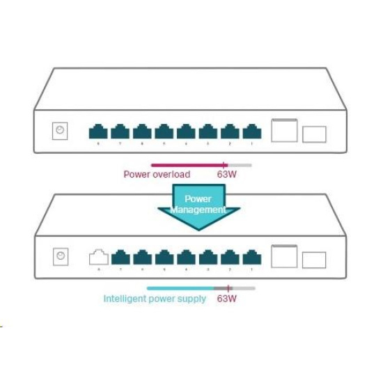 - Vysoký PoE rozpočet napájení s až 30W na každý PoE port a 63W na všechny PoE porty