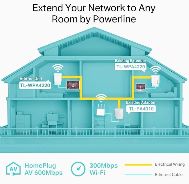 TL-WPA4220 přemění vaši stávající elektrickou síť na vysokorychlostní internetovou síť bez nutnosti dalších kabelů či vrtání. Rozšiřující jednotka TL-WPA4220 podporuje sofistikovaný standard HomePlug AV2 a je perfektním řešením pro rozšíření existující sítě vedené přes elektrické rozvody. Poskytuje spolehlivé a vysokorychlostní datové přenosy až 600 Mbit/s přes vedení dlouhé až 300 metrů a současně propojuje kabelovou a bezdrátovou síť všude tam, kde je k dispozici elektrická zásuvka.