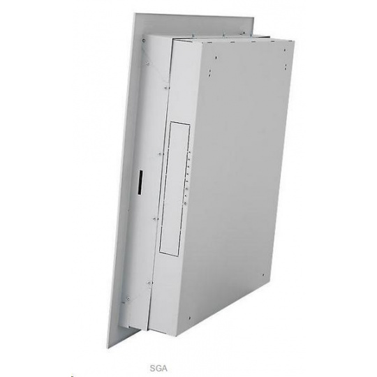 Hybridní domovní rozvaděč SHA - IP20, nosnost 30 kg. Rozvaděč je určen k montáži pod omítku (model SGA) SVISLÁ MONTÁŽ V horní polovině je skříň vybavena posuvnými držáky pro osazení 19“ patch panely, případně jističovou vanou. VODOROVNÁ MONTÁŽ Na bocích v dolní polovině skříně jsou připraveny držáky pro 19“ zařízení. VYLAMOVACÍ ZÁSLEPKY Ve stropě a dně skříně jsou připraveny kabelové vstupy kryté vylamovacími záslepkami..