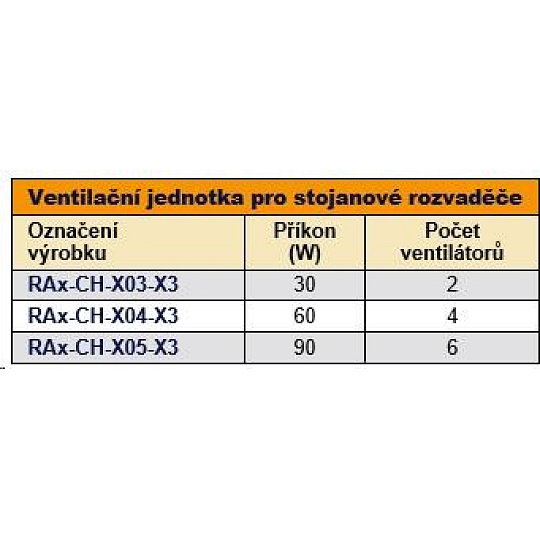 Ventilační jednotka pro stojanové rozvaděče – do čepice se instaluje z venkovní strany rozvaděče, do základny pak z vnitřní strany rozvaděče. Při instalaci do základny rozvaděče je nutno použít montážní rám spodní ventilační jednotky – RAx-CH-Xxx-X1, který se instaluje pomocí oboustranné lepící pásky.