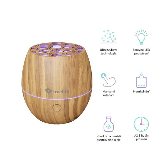 Difuzér Truelife provoní vzduch v místnosti během chvilky, stačí do nádržky přidat pár kapek esenciálního oleje. Ať už jste milovníky aromaterapie, chcete si vytvořit příjemnou relaxační atmosféru nebo vás trápí nepříjemné pachy z okolí, difuzér pro vás bude ideálním pomocníkem. Funguje na principu ultrazvuku, který mění vodu v nádržce na jemnou páru. Na výběr máte ze 7 variant barevného LED podsvícení. Potěší vás jistě i svým originálním, a přesto nadčasovým designem.