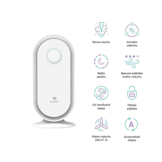 Čistička vzduchu TrueLife vyčistí až 260 m3 vzduchu za hodinu. Je vhodná do místnosti o velikosti 25-30 m2 a díky nízké hmotnosti jí můžete bez obav přenášet. Čistička celkově zlepšuje kvalitu vzduchu, ničí viry, bakterie a další nečistoty a může tak významně pomoci alergikům nebo astmatikům. Čistička je opatřena barevnými indikátory kvality vzduchu, funkcí automatické detekce nečistot a automatického čištění. Bydlíte-li na místě, kde se často práší, potěší vás přítomnost prachového senzoru. 6 násobná filtrace v podobě anti-bakteriálního filtru, HEPA filtru, uhlíkového filtru, katalytického filtru, UV světla a ionizace zachytí až 99,9% polétavého prachu a vyčistí 93,5 % těkavých organických látek. Zároveň zachycuje i viry a koronaviry.