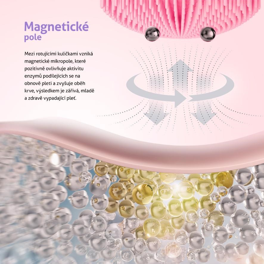 Magnetické mikropole vznikající mezi rotujícími masážními kuličkami podporuje vstřebávání pleťových přípravků a také revitalizaci a vypnutí pleti díky aktivaci enzymů podílejících se na její obnově.