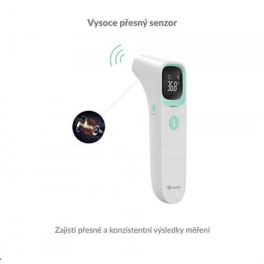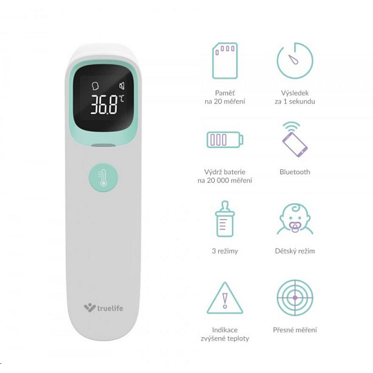 Zdlouhavému držení teploměru v podpaží odzvonilo. Usnadněte si měření teploty při chřipce nebo nachlazení s bezkontaktním teploměrem TrueLife Care Q10 BT. Teplotu dokáže změřit během sekundy s přesností na 0,1°C. TrueLife Care Q10 BT nabízí tři režimy měření, díky kterým dokážete bezkontaktně změřit přesnou teplotu osob z ucha nebo čela, i předmětů nebo tekutin Naměřené hodnoty se zobrazují na LCD displeji a jsou doprovázeny barevným indikátorem a zvukovým signálem. Díky zabudovanému Bluetooth lze teploměr spárovat s telefonem a hodnoty měření uchovávat v mobilní aplikaci. Teploměr se díky jeho malým rozměrům perfektně hodí na cesty, dokáže si zapamatovat 20 naměřených hodnot, a jeho baterie vystačí až na 20 000 měření.