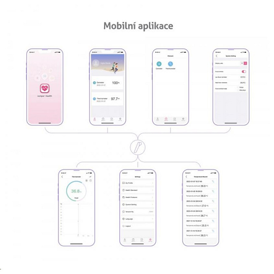 Díky zabudovanému Bluetooth lze teploměr spárovat s telefonem a hodnoty měření uchovávat v mobilní aplikaci.