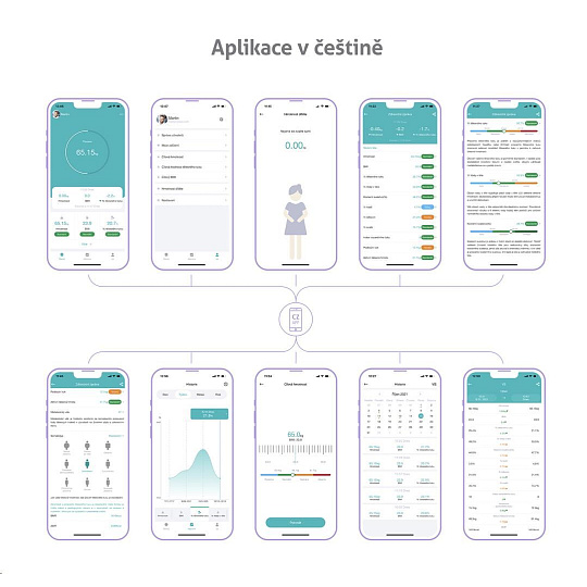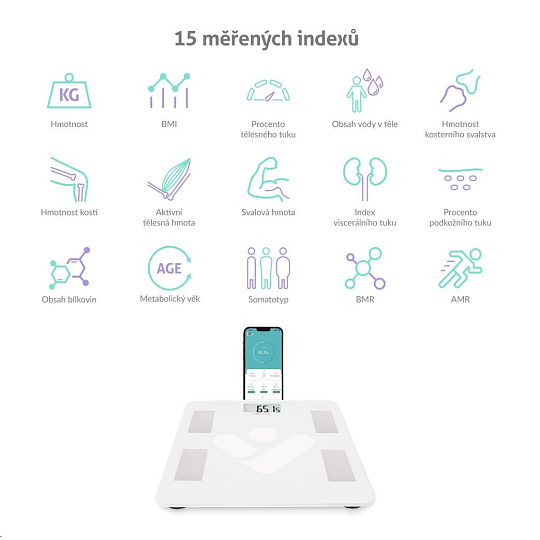 Inteligentní váha s Bluetooth, aplikace v CZ, měření 15 tělesných indexů, paměť pro 12 uživatelů, kompletní historie měření v aplikaci, Health Report - statistiky, grafy, nastavování cílů, doporučení, technologie bioelektrické impedance (BIA), kompatibilita s Apple Health Kit, Google Fit, FitBit, odchylka vážení 0.1 kg, tvrzené sklo, LED displej, offline režim, napájení: 2 x 1.5V AAA baterie..... více