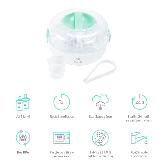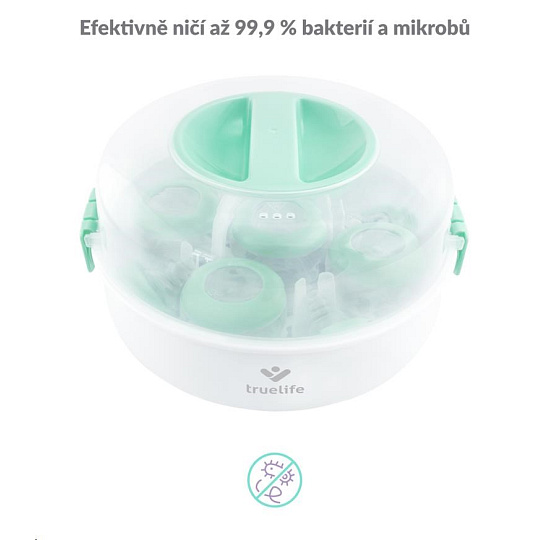 Ochrana imunitního systému vašeho dítěte pro vás nemusí znamenat neustálé vyvařování lahviček a dudlíků. Se sterilizátorem do mikrovlnné trouby TrueLife Invio MS5 sterilizujete dětské lahvičky, kousátka a další předměty během dvou minut. K tomu potřebujete jen obyčejnou vodu a mikrovlnou troubu. Sterilizátor využívá nemocniční metodu parní sterilizace, která je rychlá, účinná a bez chemických látek. Ničí tak 99,9 % bakterií a mikrobů, které se na dětských předmětech nacházejí, aniž by poškodil jejich povrch. Sterilizátor je navržen pro většinu mikrovlnných trub na trhu a zvládne většinu typů kojeneckých lahví. Pojme až 5 lahviček naráz a snadno se ovládá. Díky kompaktním rozměrům s ním můžete bez problému cestovat.