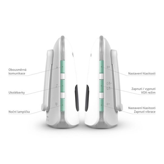 Chůvička umožňuje obousměrnou komunikaci, můžete tedy děťátko utěšovat již cestou k němu. Praktické jsou rovněž integrované ukolébavky. Zvolit lze z 8 přednastavených tu, kterou si dítě nejvíce oblíbí. Jejich hlasitost jednoduše nastavíte. V noci jistě oceníte i možnost využití chůvičky jako lampičky, kdy tlumené světlo děti uklidňuje.