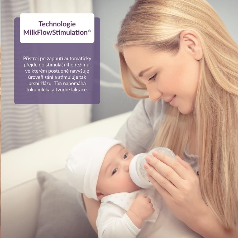 Vlastnosti a funkce Bez BPA, 2fázové odsávání, možnost nastavení intenzity odsávání - 9 úrovní, 3 režimy – odsávání, stimulace, masáž, technologie MilkFlowStimulation®, časovač pro automatické vypnutí, zásobník na mléko 150 ml, výdrž 100 minut, elektrický pohon, zamezení zpětného toku, LED displej s dotykovými tlačítky, tichý chod, ergonomický design, nízká hmotnost