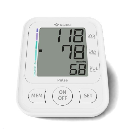 Tlakoměr Truelife Pulse využívá oscilometrickou metodu měření tlaku a funguje na principu nafouknutí manžety, která zajišťuje maximální přesnost naměřených hodnot. Navíc jeho ovládání je velmi jednoduché a vše podstatné zvládnete stiskem tlačítka START/STOP. Naměřené hodnoty zobrazuje velký a dobře čitelný třířádkový displej.