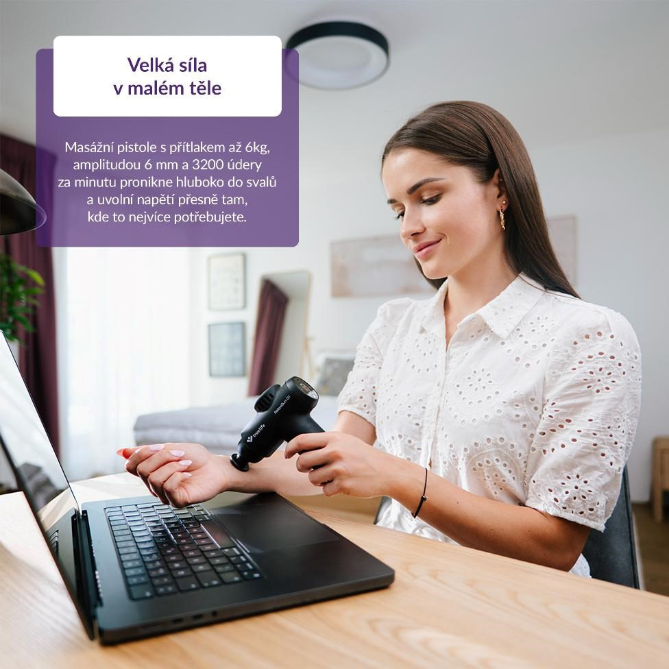 Ať už sportujete na vrcholové úrovni, pracujete jako fyzioterapeut, trávíte většinu dne u počítače, nebo jen hledáte efektivní způsob, jak ulevit unaveným svalům, masážní pistole TrueLife RelaxGun G1 je ideální volbou pro regeneraci i relaxaci. Nabízí 30 úrovní intenzity, přítlak 6 kg a frekvenci až 3200 kmitů za minutu, takže se snadno přizpůsobí vašim potřebám – od jemné relaxační masáže až po intenzivní hloubkovou terapii. Čtyři vyměnitelné silikonové hlavice umožňují cílenou péči o různé části těla, zatímco inteligentní funkce jako automatický frekvenční přítlak a bezpečnostní zastavení (Safety stop) zajistí maximální komfort a bezpečí. S tichým provozem, dlouhou výdrží baterie až 3 hodiny a moderním USB-C nabíjením je TrueLife RelaxGun G1 ideálním pomocníkem doma, ve fitku, v práci i na cestách. Dopřejte si péči kdykoliv potřebujete – pro rychlou regeneraci, úlevu od bolesti, prevenci zranění i podporu celkové pohody.