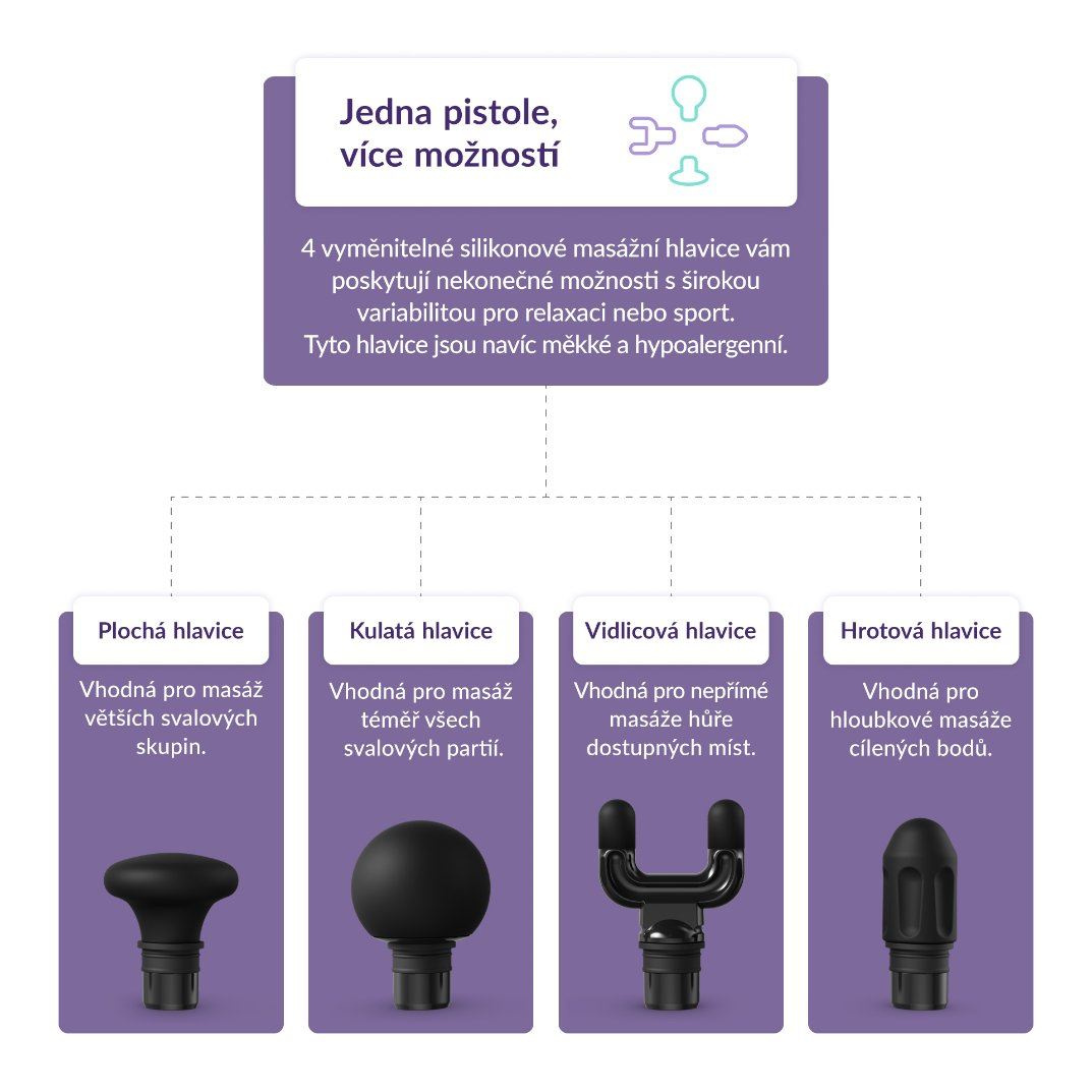 RelaxGun G6 Metal disponuje hned 4 vyměnitelnými silikonovými hlavicemi, určenými na různé části těla a pro široké využití. Měkké, silikonové a hypoalergenní provedení je oproti tomu běžnému plastovému šetrné k pokožce, odolné a dobře se udržuje. Pro masáž větších svalových skupin se hodí plochá hlavice Flat Head, jejíž tlak je jemnější, což oceníte například v blízkosti kostí. Obtížně dostupná místa jako trapézy či achillovu šlachu promasíruje hlavice Fork Head, která se snadno přizpůsobí konturám těla. Téměř pro všechny svalové partie se hodí kulatá hlavice Ball Head, jež se tělu dokonale přizpůsobí. Pro cílenou masáž konkrétních bodů na těle, tzv. trigger pointů, je určena hrotová hlavice Bullet Head.