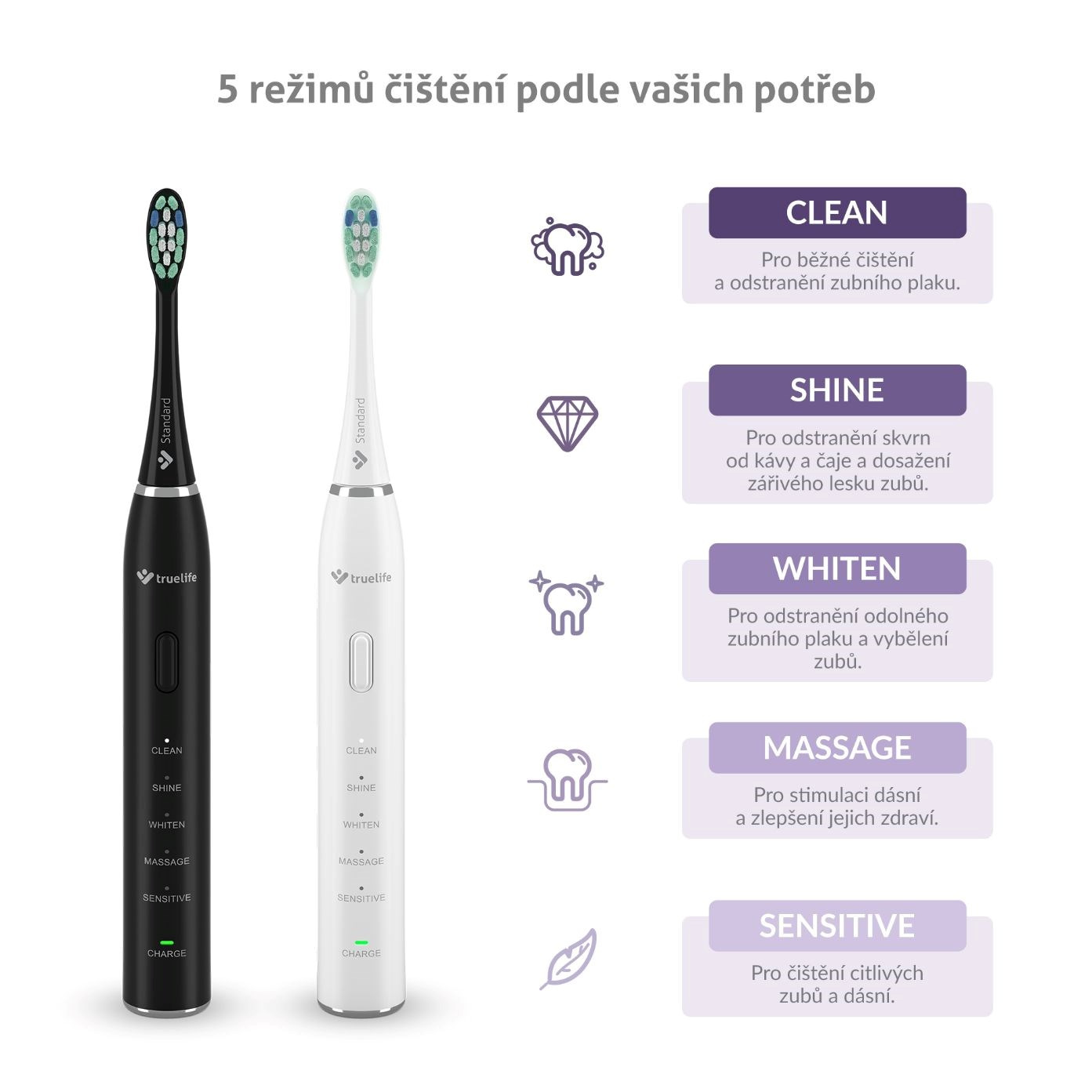 Sonické kartáčky TrueLife SonicBrush Clean30 obsažené v sadě disponují 5 režimy čištění, jež usnadňují každodenní péči o zuby a dásně. Běžné čištění obstará režim Clean, s odolnějším zubním plakem zatočí režim Whiten, který zároveň přispívá k bělení zubů. Dokonale zářivý úsměv zajistí režim Shine efektivně odstraňující pigmentové skvrny způsobené například kávou či čajem. Patříte-li k lidem s citlivějšími zuby a dásněmi, pak oceníte režim Sensitive. Ke zdravějším dásním přispěje režim Massage, a to jejich stimulací. Ideální doba čištění jsou 2 minuty, hlídat je ale nemusíte, časovač to obstará za vás. Také vždy po 30 sekundách upozorní, že je čas přesunout se na další část chrupu.