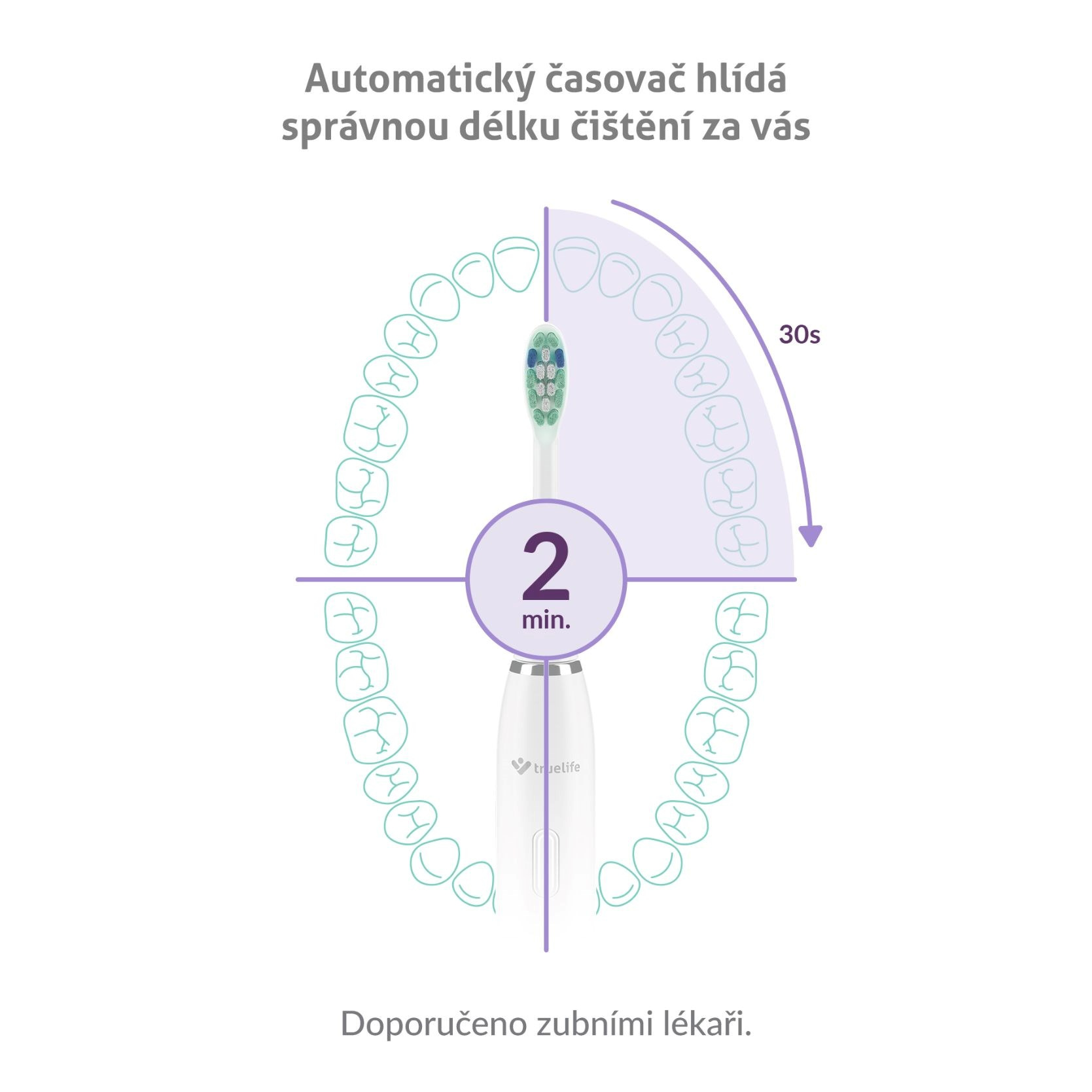 Časovač natavený na 2 minuty je rozdělen do 4 částí po 30 sekundách. Krátké přerušení vždy upozorní, že je čas začít čistit další část chrupu.