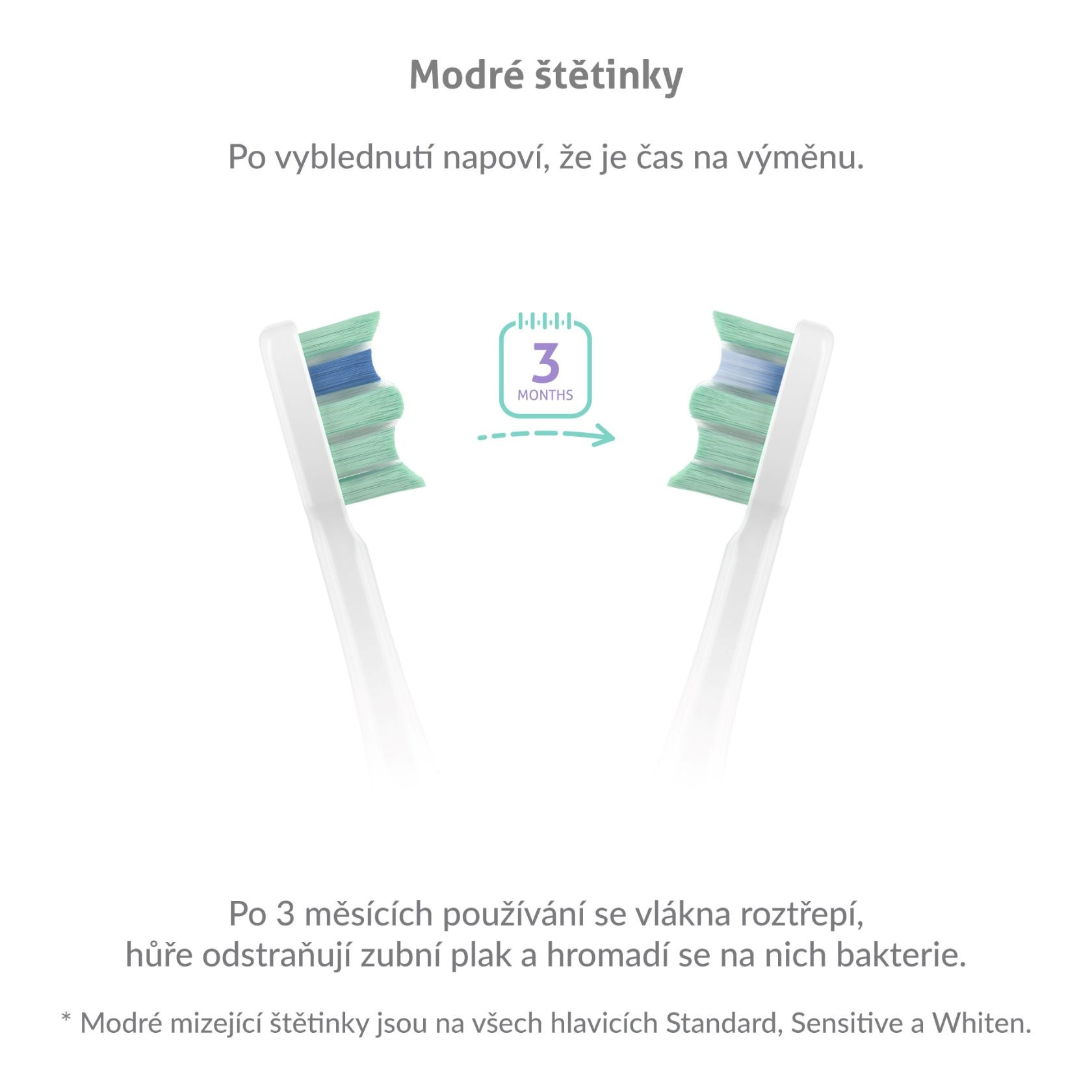 Zhruba po 3 měsících je třeba vyměnit hlavici kartáčku, aby byla zajištěna kvalita čistění. Poznáte to dle modrých štětinek, které postupně bělají.