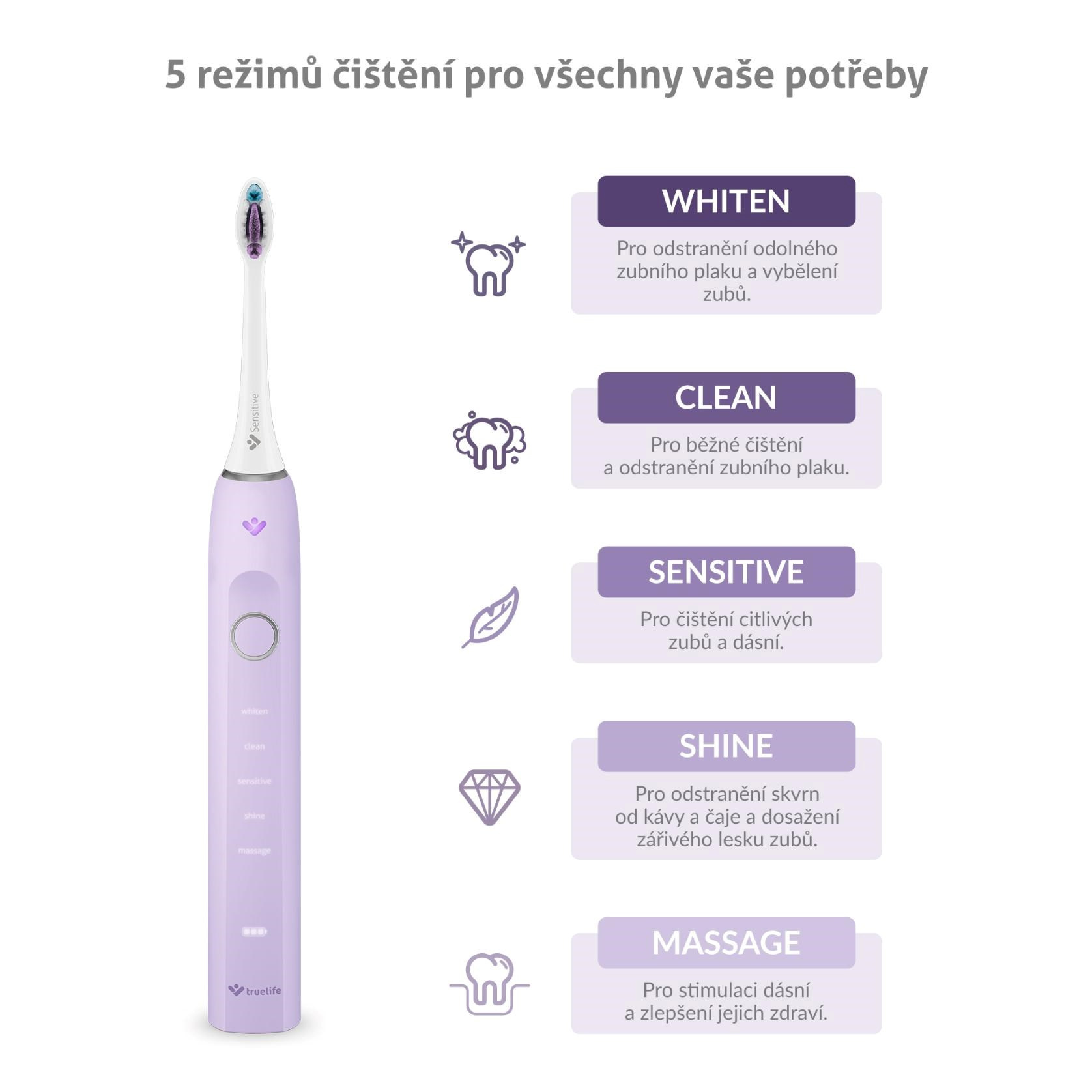Stačí jediný kartáček pro vyřešení nejrůznějších obtíží. Balení sonického kartáčku TrueLife SonicBrush Clean70 UV zahrnuje 2 hlavice. Standard pro každodenní čištění a Sensitive s extra jemnými štětinkami pro citlivé zuby. Dokoupit lze i hlavici Whiten pro bělení zubů. Hlavice však nejsou jedinými pomocníky při péči o zuby a dásně, svou práci vykoná také 5 režimů čištění. S běžným čištěním si poradí režim Clean, o citlivé zuby a dásně se postará režim Sensitive, pro zářivý lesk a odstranění skvrn od čaje a kávy použijte režim Shine, o odstranění odolného zubního plaku a vybělení zubů se stará režim Whiten, chcete-li zlepšit zdraví dásní a stimulovat je, režim Massage je tím pravým.