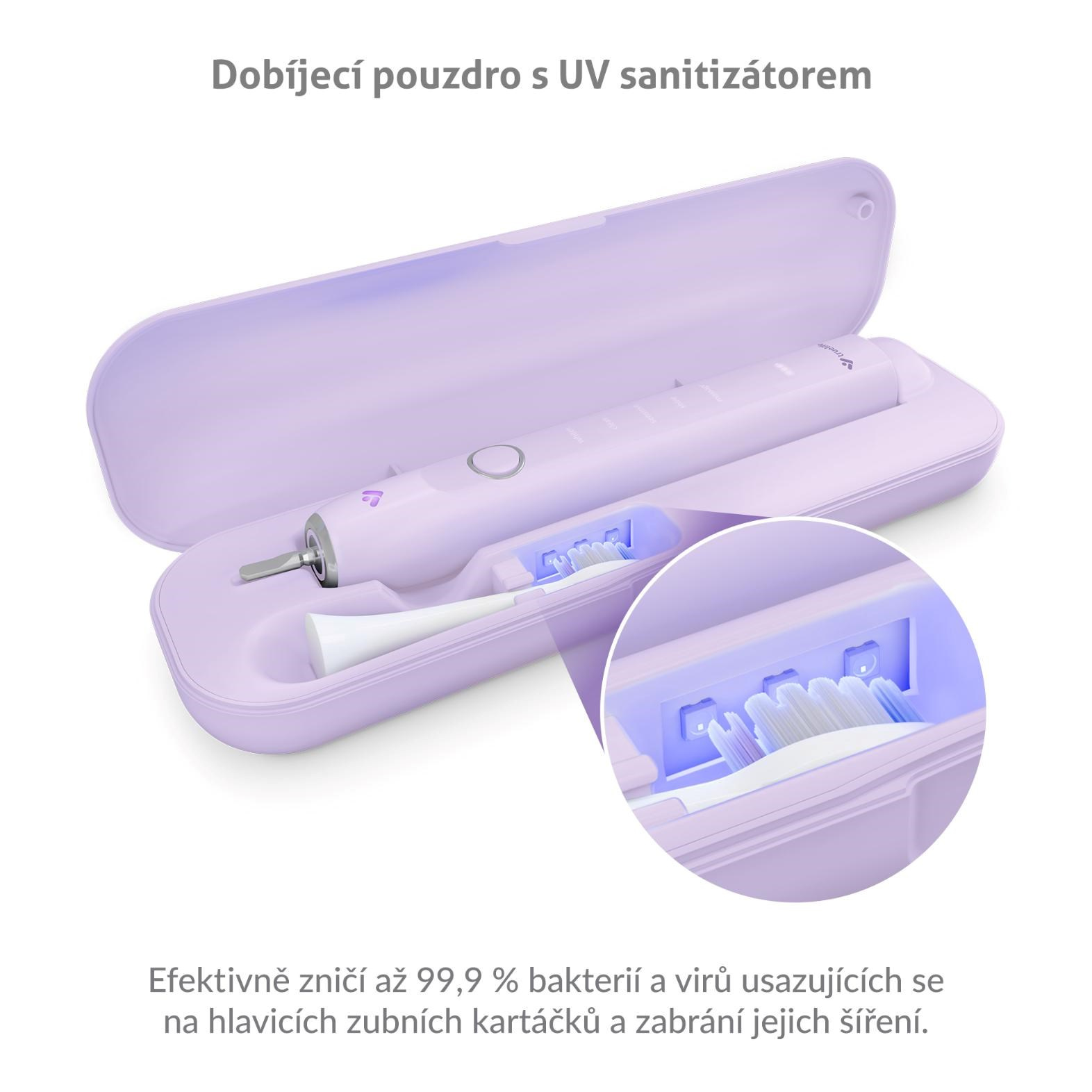 Na hlavicích kartáčů se usazují viry a bakterie, které mohou způsobit nepříjemnosti v ústní dutině. Stačí však 5 minut a UV sterilizace jich až 99,9 % zničí. Pouzdro vydrží na jedno nabití až 17 dní při použití 2× denně.