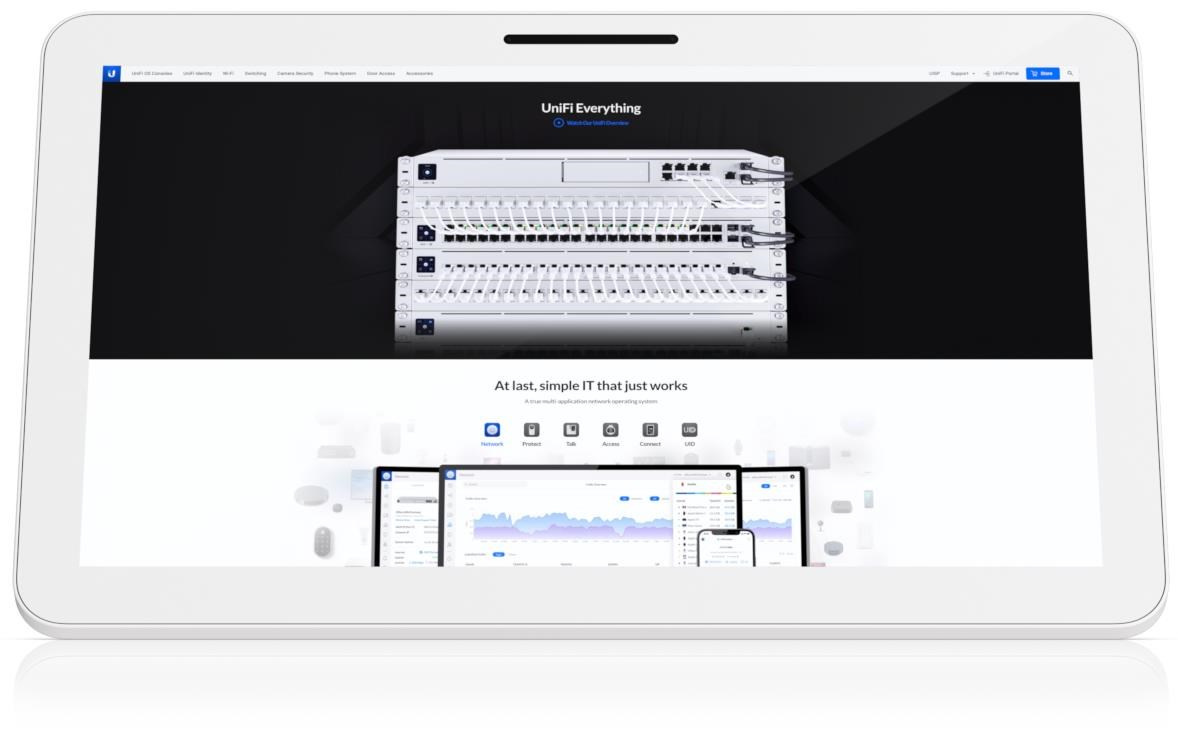 Popis produktu UC-Display je samostatné dotykové zobrazovací zařízení spravované aplikací UniFi Connect. Displej s úhlopříčkou 21,5" pohání operační systém Android a je vybaven mikrofonem i reproduktorem. Lze jej uchytit na držák standardu VESA (adaptér pro montáž na VESA držák je součástí balení). Volitelně lze dokoupit další adaptéry pro povrchovou nebo zapuštěnou montáž, stojan na stůl nebo držák na polohovacím rameni. Instalace je možná jak v horizontální tak vertikální poloze, samozřejmostí je funkce automatického otočení obrazu. Připojení do sítě a zároveň napájení zajišťuje 1Gbps ethernetový port s podporou POE++ (802.3at+/bt). V budoucnu se počítá také s využitím portu USB-C. Pomocí aplikace UniFi Connect lze displeji jednoduše přiřadit 3 různé funkce: 1. Zobrazení vybraných webových stránek 2. Zobrazení zvolené Android aplikace 3. Zobrazení vlastního multimediálního obsahu (foto/video) Displej tak nabízí všestranné využití. Můžete jej použít jako kiosek na prodejně k prohlížení vlastních webových stránek a vytváření online objednávek nebo můžete nechat promítat smyčku s promo videem. Na exponovaných místech, kde se lidé zdržují delší dobu, jako například čekárny v nemocnicích nebo letištní haly, se nabízí zobrazení různých aplikací pro OS Android, napřfklad různých her nebo kvízů pro krácení času. Obsah balení • Zařízení • Adaptér pro uchycení VESA 75x75 nebo 100x100 Technické parametry Konektory a rozhraní Rychlost LAN:(1) 10/100/1000Mbps Napájení Napájení přes PoE:802.3at Typ napájení:PoE Typy PoE:PoE-In (pouze) Max. spotřeba energie [W]:27 Fyzické charakteristiky Provozní teplota [°C]:0 až 40 Hmotnost [g]:4900 Šířka [mm]:330 Výška [mm]:540 Hloubka [mm]:37.